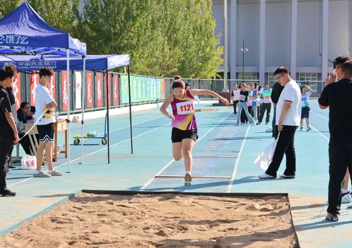 跳远沙坑旁,运动员助跑渐快,踏跳板发力后腾空舒展,扬起的细沙记录距离,落地笑容藏着突破喜悦,腾空瞬间尽显青春风采。
